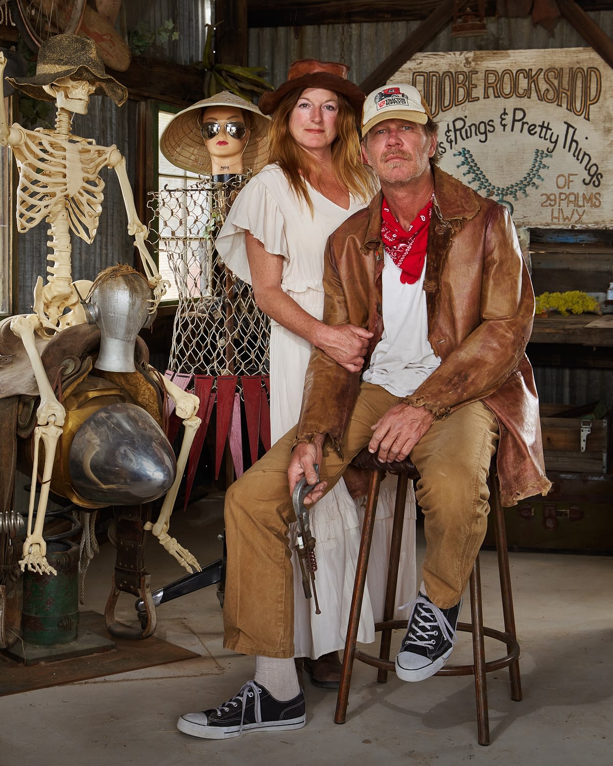 A few months ago I had the pleasure of meeting Dustin & Karen at their lovely 19 acre property in Twentynine Palms, California. It was originally a historic gold mill and home to Oren Booth, one of the original settler’s of the town. It’s full of rustic charm & sunburnt artifacts that they’ve been bringing back to life along with some new creations of their own. Dustin’s a sculptor & Karen’s a painter. They have a few art studios on the property and also use it to host events & gatherings.